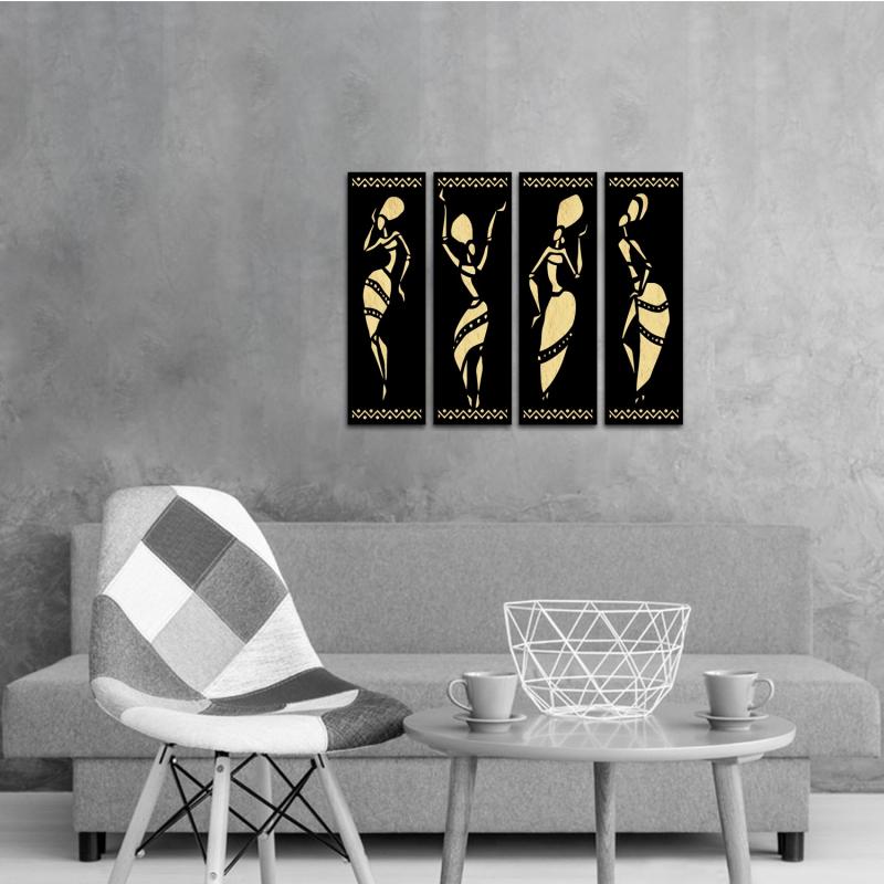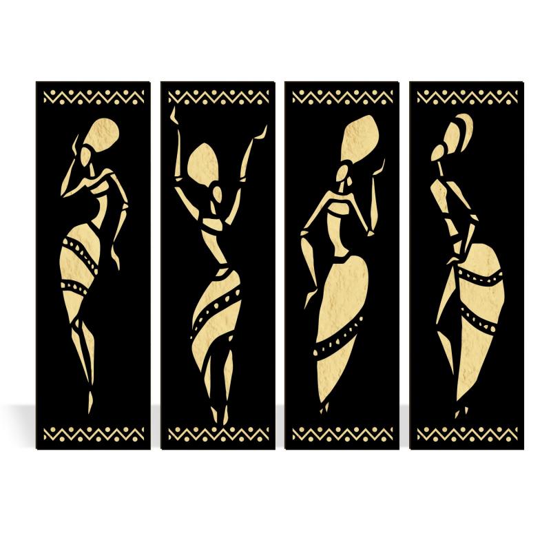 | 4'lü Afrikalı Dançı Kadınlar 2 Katlı Ahşap Oyma Tablo Altın Varak & Siyah |