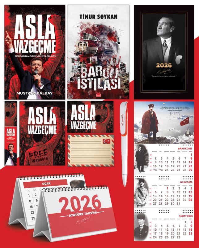 - ASLA VAZGEÇME - MUSTAFA BALBAY "Ekrem İmamoğlu, İstanbul Büyükşehir Belediye Başkanlığı'nı 2019 ve 2024'te üç kez kazandı. Her seferinde, “Daha fazlasını yapabilirim” mesajını verdi. 2023'te Cumhuriyet Halk Partisi'nde değişimin önünü açan kişi olarak, “Türkiye'yi de değiştireceğiz” diye haykırdı. Sırada cumhurbaşkanlığı vardı. Bu hedefe yürürken 23 Mart 2025'te tutuklandı. İmamoğlu önüne her engel konduğunda şöyle haykırdı: “Asla vazgeçmeyeceğim!” Bu söz aynı zamanda tüm Türkiye'ye idi. Tutuklanmasına giden yolla, cumhurbaşkanı adaylığına giden yol Silivri'de kesişti. Esareti göze alarak, cesareti örgütledi. Türkiye ayağa kalktı. CHP Genel Başkanı Özgür Özel, dipten gelen dalgayı uzun soluklu, iktidar hedefli bir yürüyüşe çevirdi. Mustafa Balbay, beş yıl hapis yattığı Silivri Cezaevi'nde İmamoğlu'yla üç kez görüştü. Mücadelesini kendi ağzından dinledi, yazdı. Bu kitapta, gerilimli, sürprizlerle dolu, macera romanlarını aratmayan olaylarla karşılaşacaksınız… Bu kitapta, pes etmeyi hafızasından silmiş, kararlı bir insanı daha yakından tanıyacaksınız… Bu kitapta, Silivri duvarlarına bakınca ufku gören bir liderin uzun yolculuğuna eşlik edeceksiniz…" BARON İSTİLASI - TİMUR SOYKAN Türkiye nasıl dünya mafyasının üssüne dönüştü? Düşmanlarını öldürüp kıyma makinesinden geçiren ve kebap yapan Sırp mafya babası İstanbul'a neden geldi? Balkan mafyasının işkence ve cinayet villası neredeydi? Ded Hasan, Rövşan Caniyev ve Lotu Quli arasında Rusya'da başlayan savaş, Türkiye'ye nasıl sıçradı? “Kanuni Hırsız”ları kimler koruyordu? Avrupa'nın en çok aranan Hollandalı uyuşturucu baronuna oturum iznini kimler verdi? Sırp asıllı İsveç vatandaşı uyuşturucu kaçakçısı, Bulgaristan pasaportuyla nasıl Türk vatandaşı yapıldı? Avustralya'daki motosiklet çetesinin liderleri, Türkiye'den dünya uyuşturucu trafiğini nasıl yönetti? Yeni Zelandalı ve Avustralyalı uyuşturucu baronları, Türk vatandaşlığını nasıl pazarladı? İsveçli çetelerin Türk vatandaşlığı alan liderleri İstanbul'da kiminle ve neden çatıştı? Kırmızı Bülten'le aranan uyuşturucu baronlarına, çete liderlerine, silah kaçakçılarına vatandaşlığı kimler satıyor? Tonlarca kokain yüklü gemiler, keskin nişancılar, silikon maskeli tetikçiler, zehirli planlar, mıknatıslı bombalarla suikastlar, cani mafya babaları, kravatlı çeteler, yeraltı dünyası ile yerüstünün kardeşliği... Hepsi Baron İstilası'nda... 2026 Atatürk Ajandası • Günlük, haftalık ve aylık olarak bölünmüş • Her gün için Atatürk'ün bir sözü • Amerikan Bristol Kapak • 160 Sayfa • 70g kitap kağıdı 3 Parça Spiralli 2026 Atatürk Gemici Duvar Takvimi • Ürün Ebadı: 27,5x65 cm • Blok Ebadı: 27,5x13,5 cm • Üst Karton Ebadı: 27,5x20 cm • Yapraklar: 80 g 1. Hamur • Alt Karton: 350 g Bristol • Göstergeli 2026 Masa Takvimi Atatürk İmza Baskılı Kalem