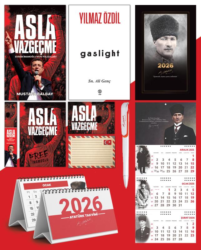 - ASLA VAZGEÇME - MUSTAFA BALBAY "Ekrem İmamoğlu, İstanbul Büyükşehir Belediye Başkanlığı'nı 2019 ve 2024'te üç kez kazandı. Her seferinde, “Daha fazlasını yapabilirim” mesajını verdi. 2023'te Cumhuriyet Halk Partisi'nde değişimin önünü açan kişi olarak, “Türkiye'yi de değiştireceğiz” diye haykırdı. Sırada cumhurbaşkanlığı vardı. Bu hedefe yürürken 23 Mart 2025'te tutuklandı. İmamoğlu önüne her engel konduğunda şöyle haykırdı: “Asla vazgeçmeyeceğim!” Bu söz aynı zamanda tüm Türkiye'ye idi. Tutuklanmasına giden yolla, cumhurbaşkanı adaylığına giden yol Silivri'de kesişti. Esareti göze alarak, cesareti örgütledi. Türkiye ayağa kalktı. CHP Genel Başkanı Özgür Özel, dipten gelen dalgayı uzun soluklu, iktidar hedefli bir yürüyüşe çevirdi. Mustafa Balbay, beş yıl hapis yattığı Silivri Cezaevi'nde İmamoğlu'yla üç kez görüştü. Mücadelesini kendi ağzından dinledi, yazdı. Bu kitapta, gerilimli, sürprizlerle dolu, macera romanlarını aratmayan olaylarla karşılaşacaksınız… Bu kitapta, pes etmeyi hafızasından silmiş, kararlı bir insanı daha yakından tanıyacaksınız… Bu kitapta, Silivri duvarlarına bakınca ufku gören bir liderin uzun yolculuğuna eşlik edeceksiniz…" GASLIGHT - YILMAZ ÖZDİL İnsan zihninde gerçeğin yerine gerçek olmayanı koymaya, yanlışı doğruymuş gibi inandırmaya deniyor, gaslight... Hiç yaşanmamış olayları yaşanmış gibi gösterip, somut olarak yaşanmış olayları hiç yaşanmamış gibi kabul ettirmeye deniyor. Cumhuriyetimizin yüzüncü yılında, hepimizin gözünün içine baka baka, usul usul, sinsi sinsi, adım adım, bambaşka bir cumhuriyeti işte bu algı yöntemiyle monte ettiler. Başlığı niye İngilizce yazdın diye merak edebilirsiniz. Çünkü, bu kavramın Türkçe karşılığı yok. 2026 Atatürk Ajandası • Günlük, haftalık ve aylık olarak bölünmüş • Her gün için Atatürk'ün bir sözü • Amerikan Bristol Kapak • 160 Sayfa • 70g kitap kağıdı 3 Parça Spiralli 2026 Atatürk Gemici Duvar Takvimi • Ürün Ebadı: 27,5x65 cm • Blok Ebadı: 27,5x13,5 cm • Üst Karton Ebadı: 27,5x20 cm • Yapraklar: 80 g 1. Hamur • Alt Karton: 350 g Bristol • Göstergeli 2026 Masa Takvimi Atatürk İmza Baskılı Kalem