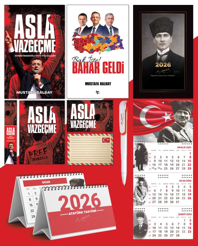 - ASLA VAZGEÇME - MUSTAFA BALBAY "Ekrem İmamoğlu, İstanbul Büyükşehir Belediye Başkanlığı'nı 2019 ve 2024'te üç kez kazandı. Her seferinde, “Daha fazlasını yapabilirim” mesajını verdi. 2023'te Cumhuriyet Halk Partisi'nde değişimin önünü açan kişi olarak, “Türkiye'yi de değiştireceğiz” diye haykırdı. Sırada cumhurbaşkanlığı vardı. Bu hedefe yürürken 23 Mart 2025'te tutuklandı. İmamoğlu önüne her engel konduğunda şöyle haykırdı: “Asla vazgeçmeyeceğim!” Bu söz aynı zamanda tüm Türkiye'ye idi. Tutuklanmasına giden yolla, cumhurbaşkanı adaylığına giden yol Silivri'de kesişti. Esareti göze alarak, cesareti örgütledi. Türkiye ayağa kalktı. CHP Genel Başkanı Özgür Özel, dipten gelen dalgayı uzun soluklu, iktidar hedefli bir yürüyüşe çevirdi. Mustafa Balbay, beş yıl hapis yattığı Silivri Cezaevi'nde İmamoğlu'yla üç kez görüştü. Mücadelesini kendi ağzından dinledi, yazdı. Bu kitapta, gerilimli, sürprizlerle dolu, macera romanlarını aratmayan olaylarla karşılaşacaksınız… Bu kitapta, pes etmeyi hafızasından silmiş, kararlı bir insanı daha yakından tanıyacaksınız… Bu kitapta, Silivri duvarlarına bakınca ufku gören bir liderin uzun yolculuğuna eşlik edeceksiniz…" BAK İŞTE BAHAR GELDİ - MUSTAFA BALBAY 2023 Türkiye'nin en uzun yılıydı. 14 Mayıs 2023'te milletvekilliği seçimi yapıldı. 14-28 Mayıs 2023'te cumhurbaşkanlığı seçimi iki turlu olarak gerçekleştirildi. Cumhur İttifakı'nın adayı Recep Tayyip Erdoğan cumhurbaşkanlığını yeniden kazandı. “Yine baharlar gelecek” sloganıyla büyük bir umut yaratan Millet İttifakı'nın adayı Kemal Kılıçdaroğlu bütün çabalarına karşın ikinci sırada kaldı. 2023'ün ikinci yarısı CHP için değişim süreci oldu. Her değişim sancılıdır. Özgür Özel 4-5 Kasım 2023'teki kurultaydan CHP'nin 8. Genel Başkanı olarak çıktı. 2023'te her şeye karşın Cumhuriyet'in 100. yılı milletin yürekten katılımıyla kutlandı. 29 Ekim 2023'te Anıtkabir, Y-Anıtkabir'di! 2024 yılı ise yerel seçim süreci ile başladı. CHP tabanı 14-28 Mayıs'ın umut yorgunu idi. Yerel seçimden beklentisini çok yükseltmedi. Ancak Özgür Özel'in liderliği, Ekrem İmamoğlu ve Mansur Yavaş'ın yarattığı büyük enerji tüm Türkiye'yi etkiledi. CHP tek başına katıldığı, kent ittifakları ve Türkiye ittifakı söylemleriyle büyük bir taban arayışına girdiği seçimden birinci parti olarak çıktı. 2023'te beklenen bahar 2024'te geldi. Mustafa Balbay, gerek 2023'ü gerekse 2024'ü her aşamasıyla yaşamış bir gazeteci olarak bu iki yılı kaleme aldı. Umudu, beklentileri ve hayal kırıklıklarını zamanın ruhunu bozmadan sıraladı. Bak İşte Bahar Geldi, sadece anın anlatımı değil, geleceğin de habercisi. Bu kitapta her şey var, sadece şu yok: Umutsuzluk! 2026 Atatürk Ajandası • Günlük, haftalık ve aylık olarak bölünmüş • Her gün için Atatürk'ün bir sözü • Amerikan Bristol Kapak • 160 Sayfa • 70g kitap kağıdı 3 Parça Spiralli 2026 Atatürk Gemici Duvar Takvimi • Ürün Ebadı: 27,5x65 cm • Blok Ebadı: 27,5x13,5 cm • Üst Karton Ebadı: 27,5x20 cm • Yapraklar: 80 g 1. Hamur • Alt Karton: 350 g Bristol • Göstergeli 2026 Masa Takvimi Atatürk İmza Baskılı Kalem