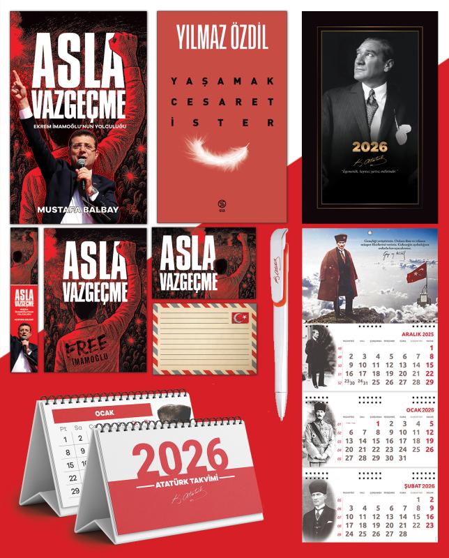 - ASLA VAZGEÇME - MUSTAFA BALBAY "Ekrem İmamoğlu, İstanbul Büyükşehir Belediye Başkanlığı'nı 2019 ve 2024'te üç kez kazandı. Her seferinde, “Daha fazlasını yapabilirim” mesajını verdi. 2023'te Cumhuriyet Halk Partisi'nde değişimin önünü açan kişi olarak, “Türkiye'yi de değiştireceğiz” diye haykırdı. Sırada cumhurbaşkanlığı vardı. Bu hedefe yürürken 23 Mart 2025'te tutuklandı. İmamoğlu önüne her engel konduğunda şöyle haykırdı: “Asla vazgeçmeyeceğim!” Bu söz aynı zamanda tüm Türkiye'ye idi. Tutuklanmasına giden yolla, cumhurbaşkanı adaylığına giden yol Silivri'de kesişti. Esareti göze alarak, cesareti örgütledi. Türkiye ayağa kalktı. CHP Genel Başkanı Özgür Özel, dipten gelen dalgayı uzun soluklu, iktidar hedefli bir yürüyüşe çevirdi. Mustafa Balbay, beş yıl hapis yattığı Silivri Cezaevi'nde İmamoğlu'yla üç kez görüştü. Mücadelesini kendi ağzından dinledi, yazdı. Bu kitapta, gerilimli, sürprizlerle dolu, macera romanlarını aratmayan olaylarla karşılaşacaksınız… Bu kitapta, pes etmeyi hafızasından silmiş, kararlı bir insanı daha yakından tanıyacaksınız… Bu kitapta, Silivri duvarlarına bakınca ufku gören bir liderin uzun yolculuğuna eşlik edeceksiniz…" YAŞAMAK CESARET İSTER - YILMAZ ÖZDİL Yaşamak cesaret ister, hele ki ulusal marşın “korkma” diye başlıyorsa, hayata karşı cesur olmak gerekir... Umudunuzu yitirdiğinizde, geleceğe dair karamsar olduğunuzda, bu kitaba sarılın, mücadelesi ilham veren insanlarımızdan güç bulacaksınız, eminim. 2026 Atatürk Ajandası • Günlük, haftalık ve aylık olarak bölünmüş • Her gün için Atatürk'ün bir sözü • Amerikan Bristol Kapak • 160 Sayfa • 70g kitap kağıdı 3 Parça Spiralli 2026 Atatürk Gemici Duvar Takvimi • Ürün Ebadı: 27,5x65 cm • Blok Ebadı: 27,5x13,5 cm • Üst Karton Ebadı: 27,5x20 cm • Yapraklar: 80 g 1. Hamur • Alt Karton: 350 g Bristol • Göstergeli 2026 Masa Takvimi Atatürk İmza Baskılı Kalem
