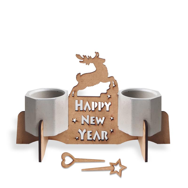 Beton Saksılı Geyik Desenli Happy New Year Ahşap Stand