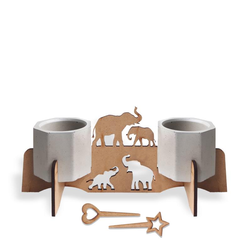 Beton Saksılı Yavrulu Fil Desenli Ahşap Stand HK1692