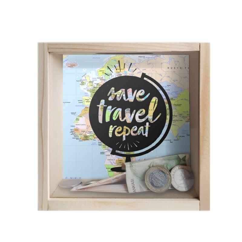 Camlı Ahşap Kumbara Dünya Turu Ham AhşapHK0662-HM