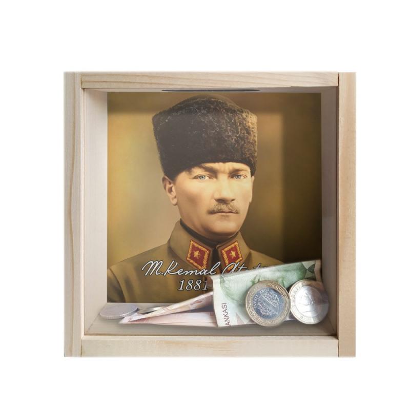 Camlı Ahşap Kumbara Kalpaklı Atatürk "Ham Ahşap"