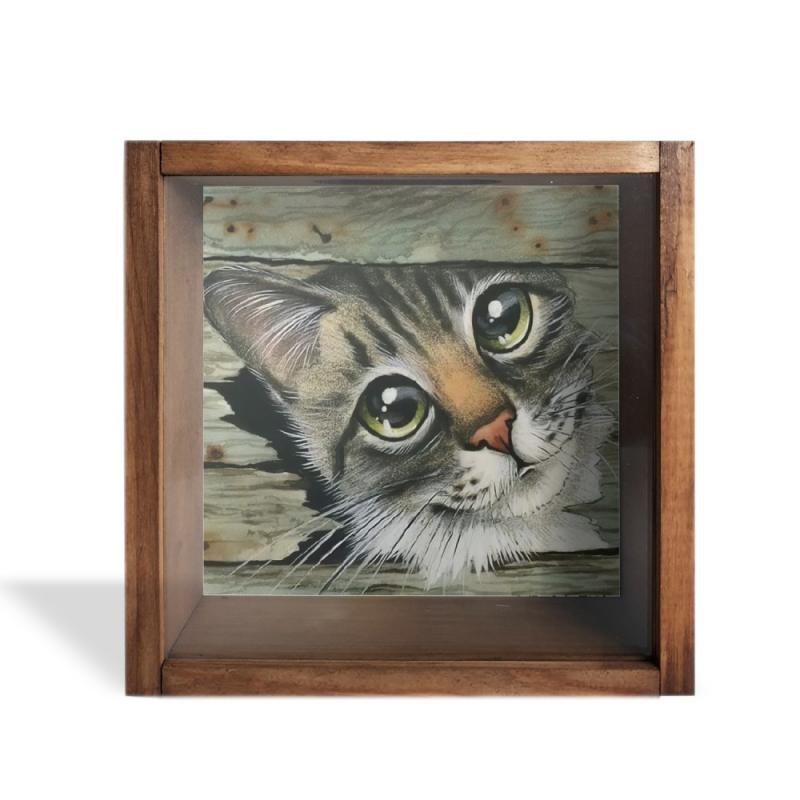 Camlı Ahşap Kumbara Kedicik HK0660