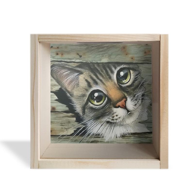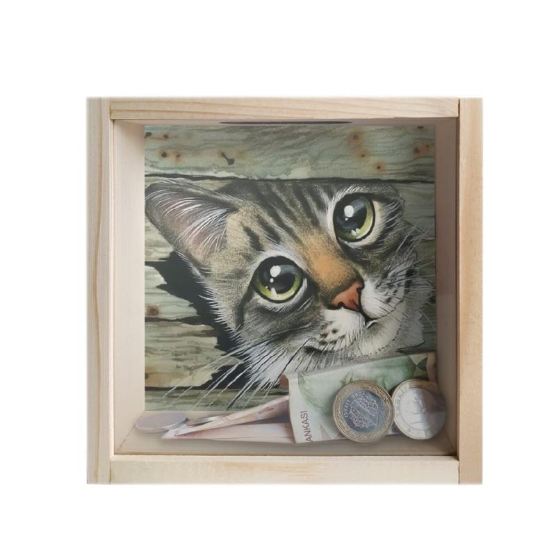 Camlı Ahşap Kumbara Kedicik Ham Ahşap HK0660-HM