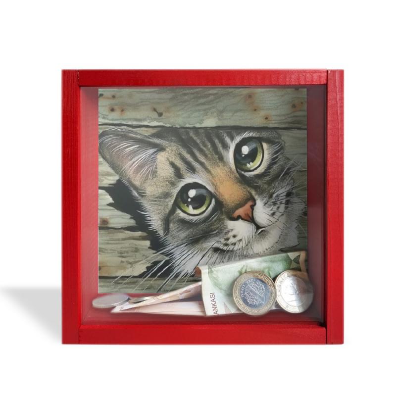 Camlı Ahşap Kumbara Kedicik Kırmızı