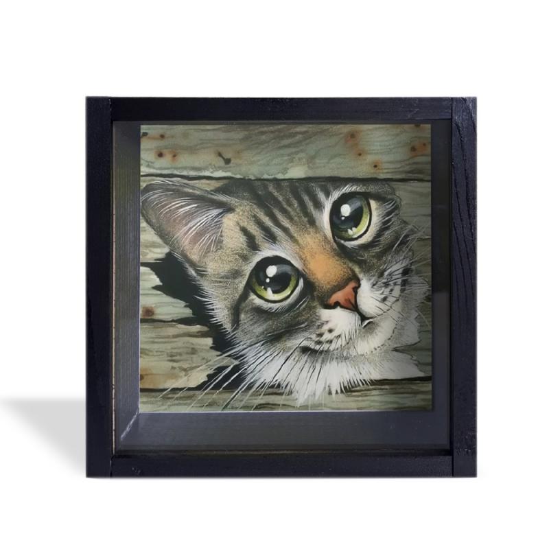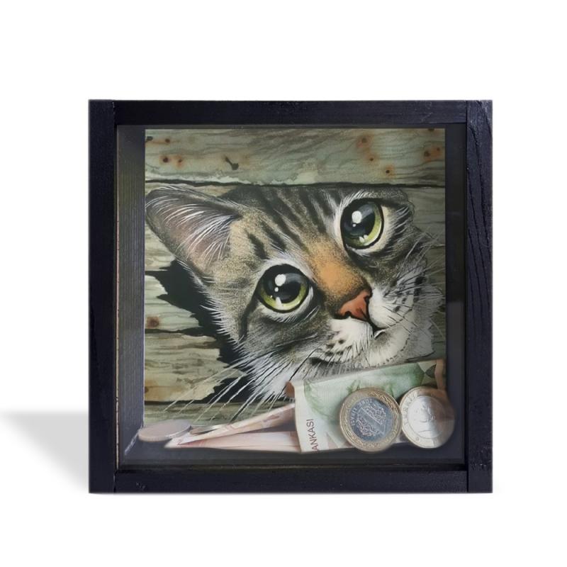 Camlı Ahşap Kumbara Kedicik Siyah