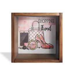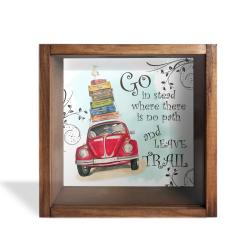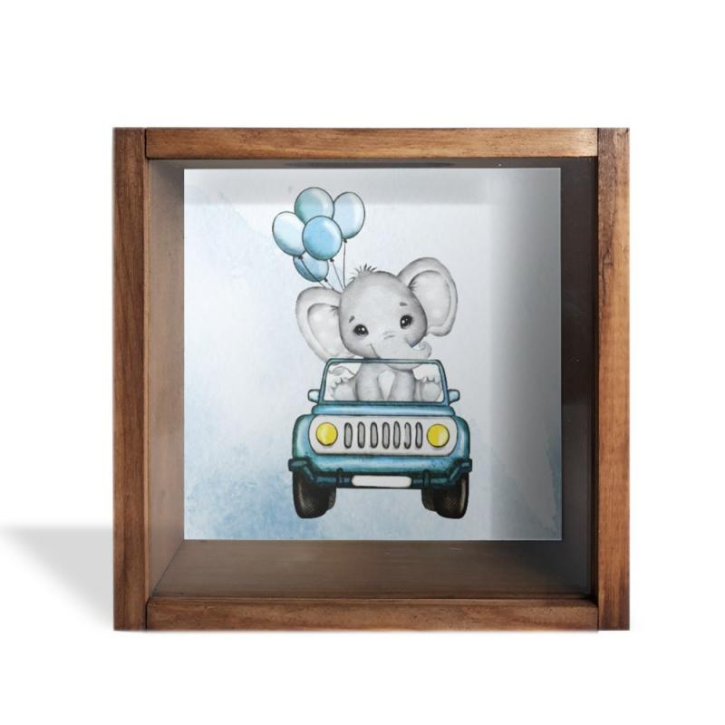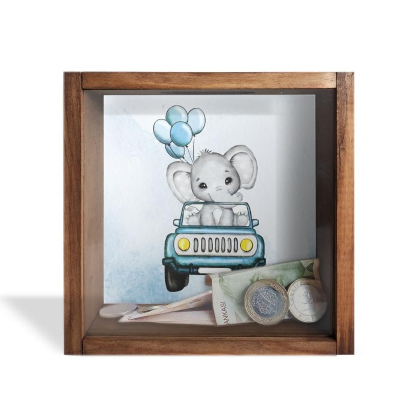 Camlı Ahşap Kumbara Mavi Arabalı Fil