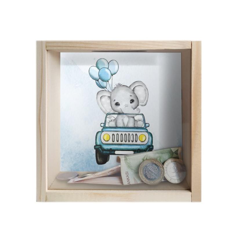 Camlı Ahşap Kumbara Mavi Arabalı Fil Ham AhşapHK0659-HM