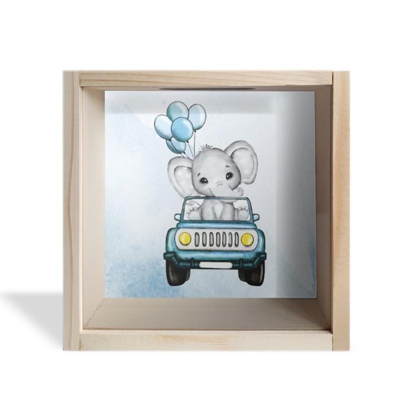 Camlı Ahşap Kumbara Mavi Arabalı Fil Ham Ahşap HK0659-HM