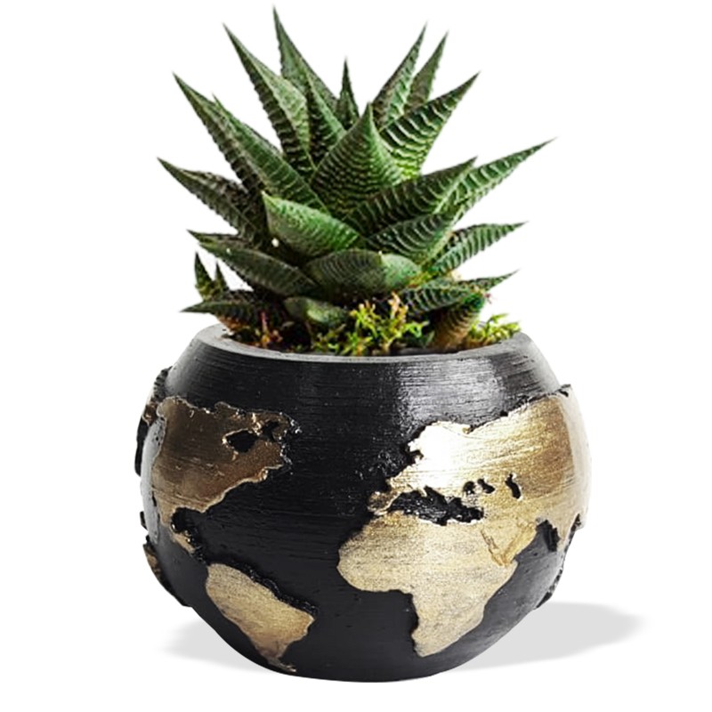Dünya Desenli Beton Saksı Siyah Altın Varaklı Küçük Boy