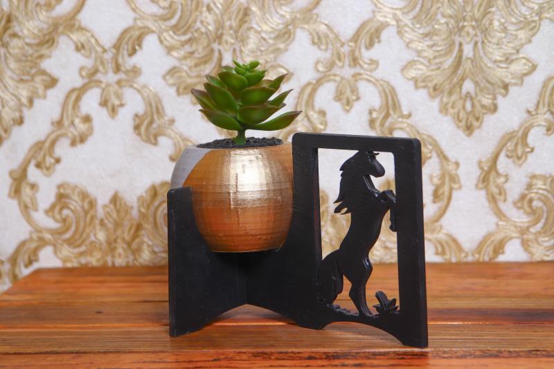 Ahşaptan at figürlü siyah renge boyanmış saksılık ve beton çift renk beton saksısıyla beraber şık bir görseli olan dekoratif saksılık.