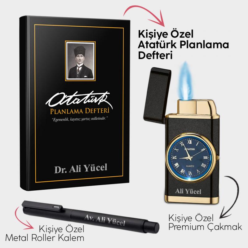 - Kişiye Özel - Kalpaklı Siyah Planlama Defteri - Mat Siyah Saatli Çakmak - Metal Roller Kalem