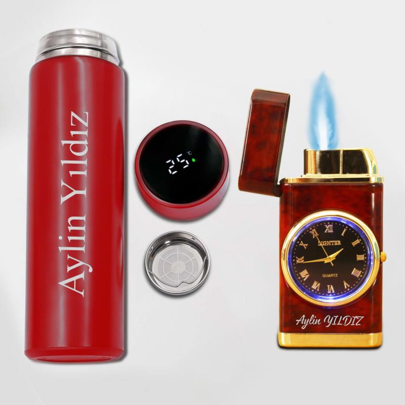 Kişiye Özel Kırmızı Dereceli Termos ve Ahşap Görünümlü Saatli Çakmak