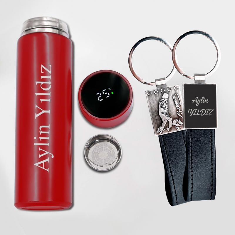 - Kişiye Özel Kırmızı Dereceli Termos ve Kocatepe Deri Anahtarlık