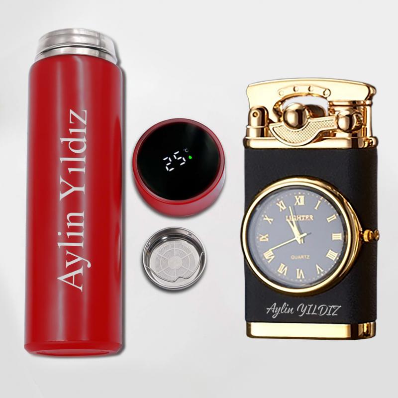 - Kişiye Özel Kırmızı Dereceli Termos ve Retro Mat Siyah Saatli Çakmak