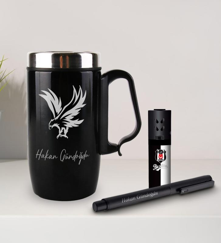 Kişiye Özel Kulplu Çelik Termos Bardak Mug 240ml - Metal Roller Kalem - Turbo Taraftar Çakmak Beşiktaş-3