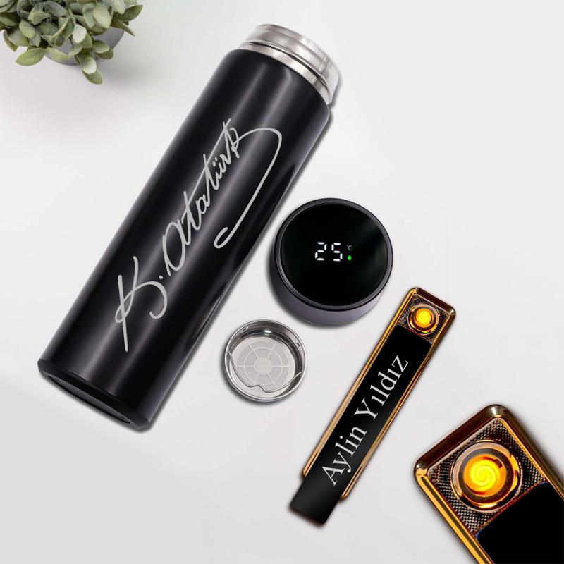 Kişiye Özel Şarjlı Sürgülü Çakmak Siyah Atatürk İmzalı Dereceli Termos