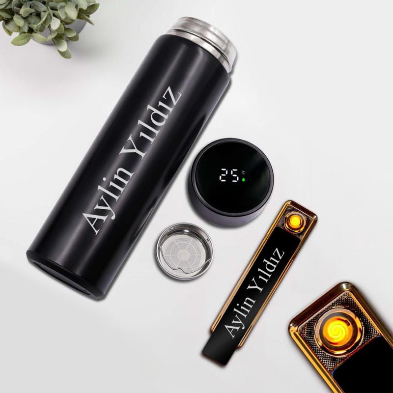 Kişiye Özel Siyah Dereceli Termos ve Sürgülü Şarjlı Çakmak