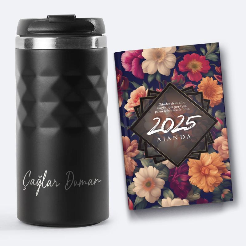Kişiye Özel Siyah Spor Paslanmaz Çelik Termos 300 ml ve 2025 Ajanda - Günbatımı