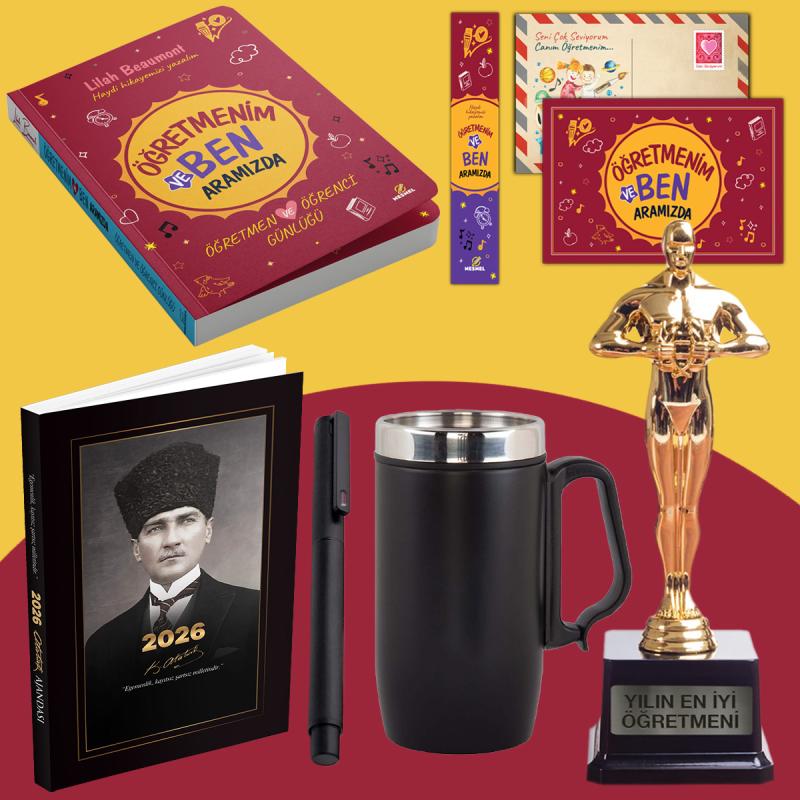 Öğretmenim ve Ben Aramızda - Oscar Heykeli - Kulplu Termos - Kalpaklı 2026 Atatürk Ajandası ve Roller Kalem