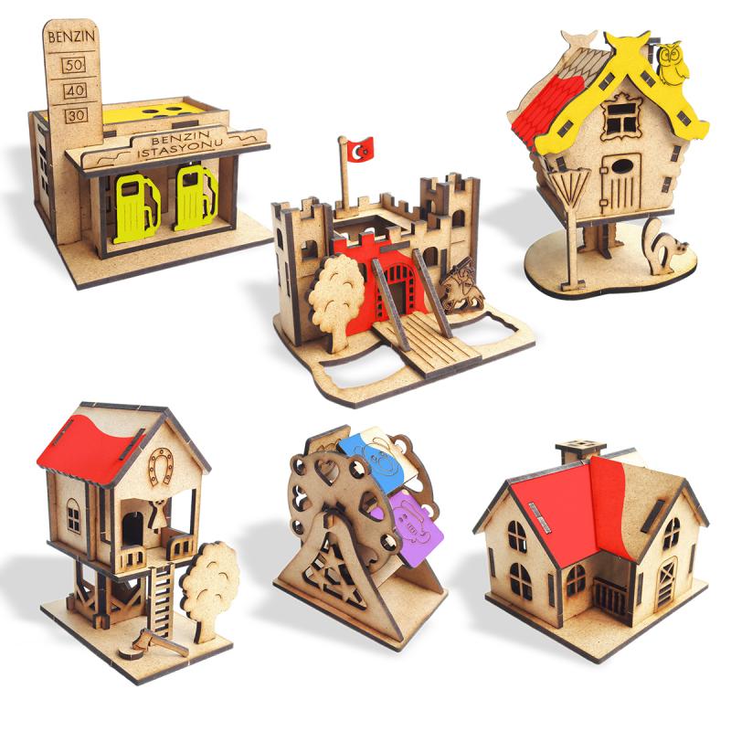 5 Adet birbirinden güzel ahşap maketleri istediğiniz gibi boyayabilirsiniz.1- Benzin İstasyonu