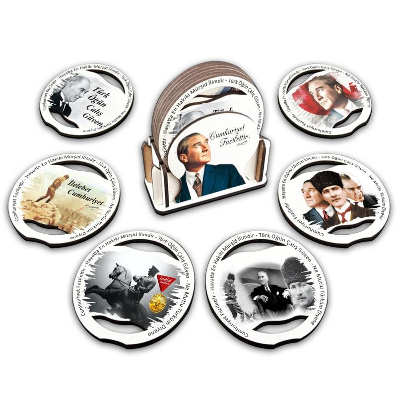 Renkli Uv Baskılı Ahşap Kutulu 6'lı Bardak Altı - Atatürk Resimli HK2509