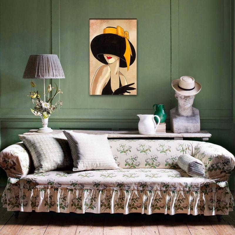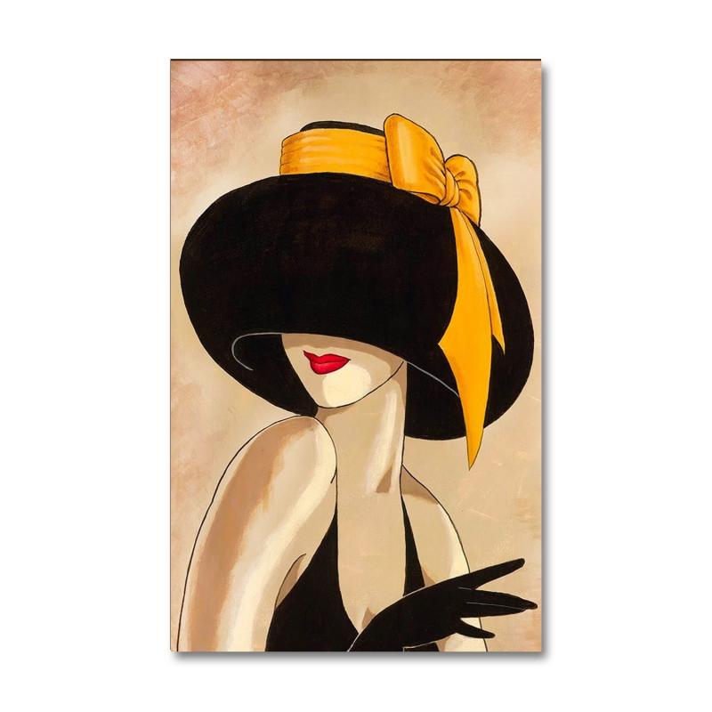 Vera Sarı Fiyonk Şapkalı Kadın Baskılı Retro Ahşap Tablo HK1305